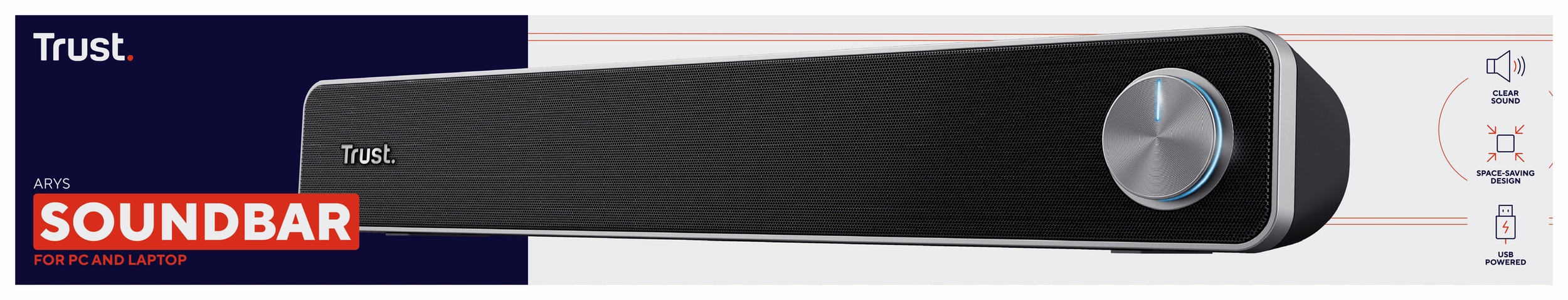 Zet het volume gemakkelijk hoger met de grote, verlichte bedieningsknop aan de voorzijde van de soundbar.