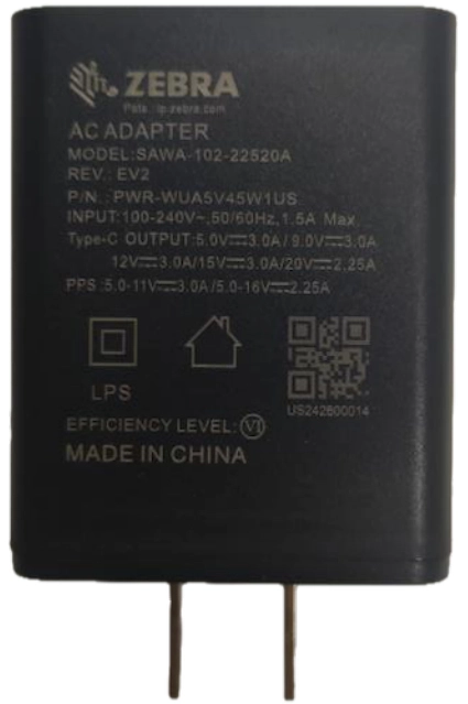 Zebra PWR-WUA5V45W1US. Type product: Batterijlader, Merkcompatibiliteit: Zebra, Compatibiliteit: EM45. Ingangsspanning: 100-240 V, Stroom: 1.5 A, Spanning: 5 - 20 V. Aantal per verpakking: 1 stuk(s)